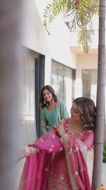 A premium ready-to-wear designer top, sharara, and dupatta set crafted in elegant Fendi Crush fabric. Detailed with zari and sequins embroidery, this outfit offers a refined festive look with comfort and graceful styling, perfect for special occasions and celebrations.