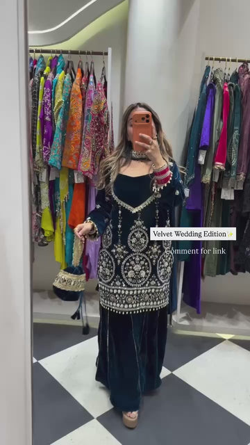 Presenting the 2025 Velvet Winter Collection, an exclusive 3-piece Kali top, palazzo and dupatta set with sequin embroidery work. Designed for the winter season with premium velvet fabric and elegant detailing.